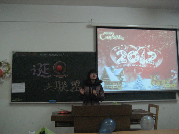经过班委们的精心准备,期待已久的晚会终于开始了。在“快乐你懂得”的歌曲中,此次“诞旦之夜”双蛋晚会拉开了序幕。杨洁,宁茜,刘茜同学也将准备好的糖果,寿司,零食依次分给大家,同学们围坐在一起,好不热闹。首先进入游戏环节“谁是卧底”,共分为三个组,每组七人,六名游戏者拿到同一词语,剩下一人拿到与之相关的另一词语。每人每轮用一句话描述自己拿到的词语,既不能让卧底察觉,也要给同伴以暗示。每轮描述完毕,投票选出怀疑谁是卧底,得票最多的人出局。反复两到三次流程,若卧底撑到最后一轮,则卧底获胜,反之,则大部队胜利。游戏者的激烈对战,相互推测,紧紧吸引了同学们的视线,将晚会气氛点燃。随后,失败的三组又以“夹气球”的游戏进行PK。在游戏中,大家相互协作,展现了学习中不一样的一面,更加亲近、了解。在大家的强烈建议与掌声下,庄晨曦用自编的骑马舞步结束了游戏环节,同学们被他逗得乐不可支,纷纷前仰后合,活动气氛也被推至最高潮。教室外虽然是严寒的冬天,但是依旧阻止不了其他班级的同学们透过窗户一览他们的风采。最后,大家一起观看了最新票房创佳影片《人再囧途之泰囧》,更是爆笑连连,整个教室都洋溢着浓浓的愉悦。