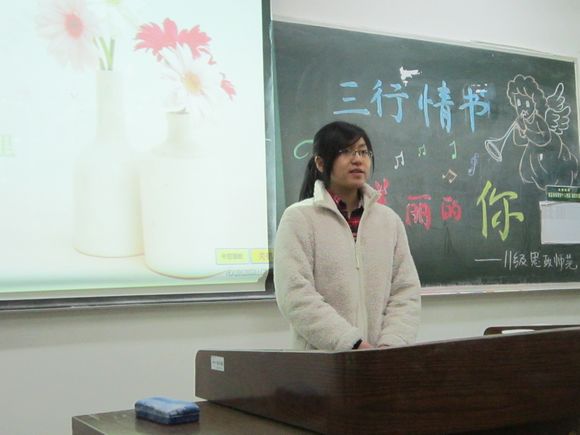 11级思政班在学明楼309教室开展了该学期的最后一次名为“三行情书---致最美丽的你”的主题班会。班会分为4个板块进行,依次为:时光是琥珀;你存在我深深的脑海里;辅导员寄语;三行情书---致最美丽的你。