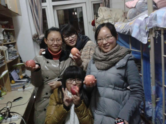 这次平安夜送苹果进宿舍活动,不仅增强了班委与同学们的交流,更是极大的增强了同学们的集体荣誉感与班级凝聚力。祝愿11级思政班在即将到来的2013年走的更好,创造更辉煌的成绩!(教师教育院:王梦云)