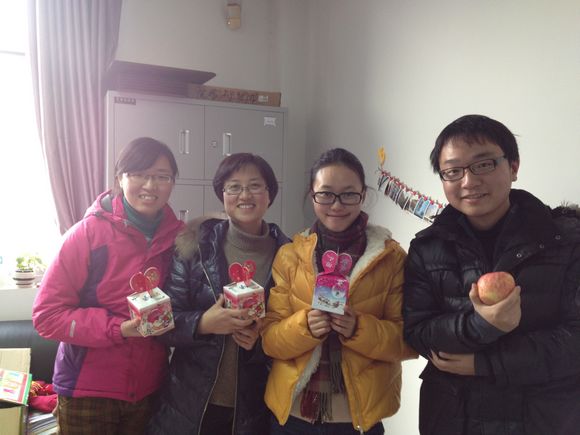经过化成楼时,一行五人迫不及待地将包装精美的苹果送到了办公室老师们的手里,老师们都很惊喜,非常感谢12汉语言文学师范班的平安夜小礼物。
