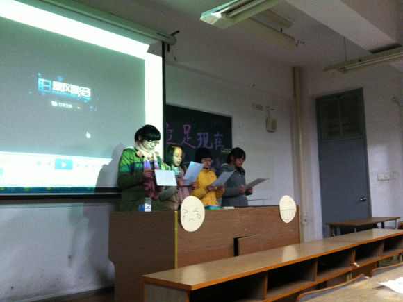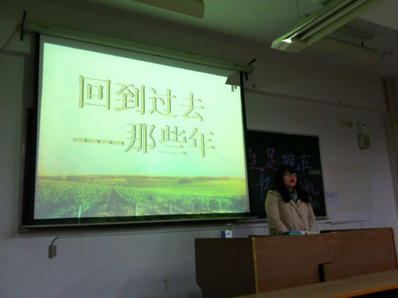 班会在比划传音的游戏中拉开了帷幕。经过两轮游戏,班级气氛活跃了起来。随后,在主持人的带领下,大家一起回顾了人人网上大学生们关于怀念高中的一些状态。在“现在的班级不像高中那样有凝聚力了”、“叫我起床的不再是梦想,而是舍友”等等这一条条的状态回顾中,大家感同身受,感慨无限,心中充满了对高中厚厚的想念。