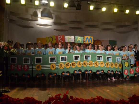 取得这样好的成绩与11级英语师范班全体同学的努力和团结一致的信念是离不开的。在第一次教师院班级全体大彩排后,英师班的班委们意识到在现场展示环节中自己班的节目并不尽如人意,还存在很多的不足。等到彩排完成后,班委们一起聆听了班主任翟老师的谆谆教诲,并向学姐请教了展示中的不足。接着班委们开了一个临时班委会,和上届班委一同商讨新的展示方案。最终确定了以“追梦之旅”为主题的梦想号小火车到站形式的现场展示,并将全班同学分为五大组:视频组、材料组、文字组、道具组和舞蹈组。并在隔天召开班级会议,分配任务,使全班同学一同参与这次大赛的准备中,发挥群众的力量,团结一致向前冲。