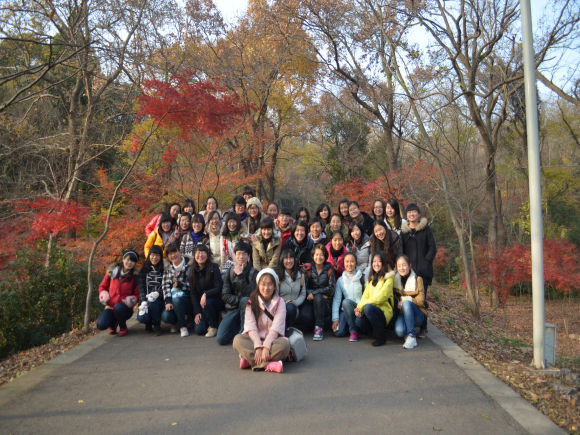 12级英语师范班同学在班长时珊,组织委员杨馨蕾的带领下,到达了本次秋游的目的地——栖霞山。