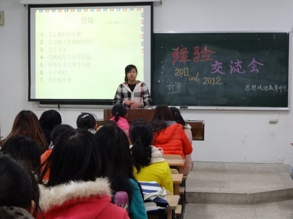 11级和12级思政师范班在仙林校区学海楼216教室举行新老生交流会。此次交流会由11级思政师范班的王梦云同学和12级思政师范班的郭怡同学主持。