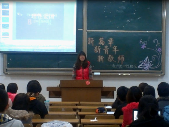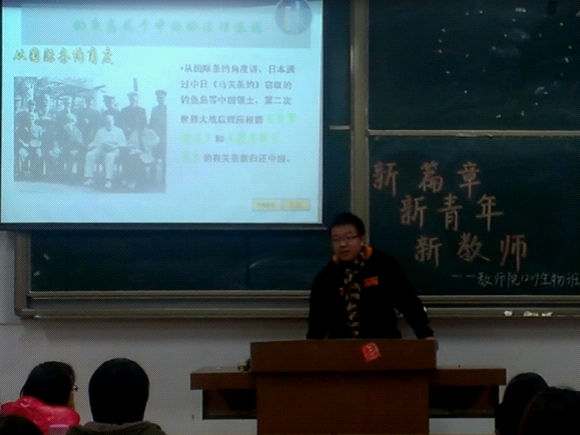 12级生物师范班在仙林校区北区教学楼609教室开展“新篇章、新青年、新教师”主题班会。本次班会由邹梦怡同学主持,话题为“从钓鱼岛谈理性爱国”。
