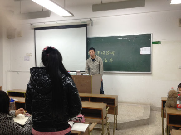 学科教学论专业的丁阳同学。丁阳同学先是向同学们介绍了考研的分类和方向:研究生分为两年制的专业硕士和三年制的学术型硕士;以及适合于大家物理师范报考的主要有教育和与物理相关的理工科,同时对于想要跨专业考研的同学也给你一些指导性意见。丁阳同学还将自己所考专业的考试科目给同学们罗列了出来,让大家对该专业的要求有了一定的了解。在命题方面,他也详细地介绍了一下,对于英语、政治这类公共,都是统一命题;而在像一些学科的专业考试,有的也会全国统一命题,但有些学校会根据自己情况自命题,提醒大家要时刻关注考试等内容,实实了解一些考研动态。