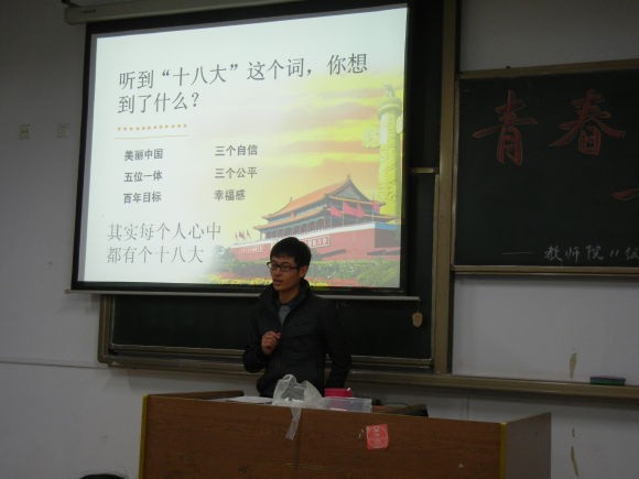 接着,活动进入第二个聆听环节。这个环节由张晨同学发言,谈了自己个人对刚刚落幕的党的十八大的感受。张晨同学从百年目标、美丽中国、幸福感等方面分条阐述了党的十八大对此的影响,最后总结为:每个人心中都有党的十八大。
