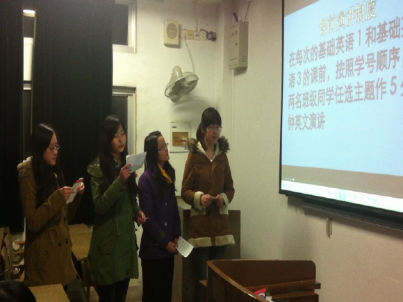 晚上6点10分,大家再次集合准备彩排。初冬的晚上寒风阵阵,但是大家的团结和热情让彼此都感受到一种温暖。在彩排前的漫长等待过程中,同学们在教室里预言了好几遍,不断追求完美。主展示人汪文倩、王露淳、程娟以及徐佳慧在详细阐明班级制度建设之余动情地解说了世纪光棍班建班以来所开展的各项活动,囊括了转专业英师班一路走来的点点滴滴。最后,在梁优子、薛东芳和高雅帅领唱下,全班合唱《最初的梦想》。在整个展示过程中班级的视频贯穿始终,令人印象深刻。当音乐声响起的刹那便似乎点燃了我们每个人心中那份对班级的热爱,对梦想的坚定。看着视频里大家灿烂的笑容,真挚的祝福,相信每个人都为之动容。