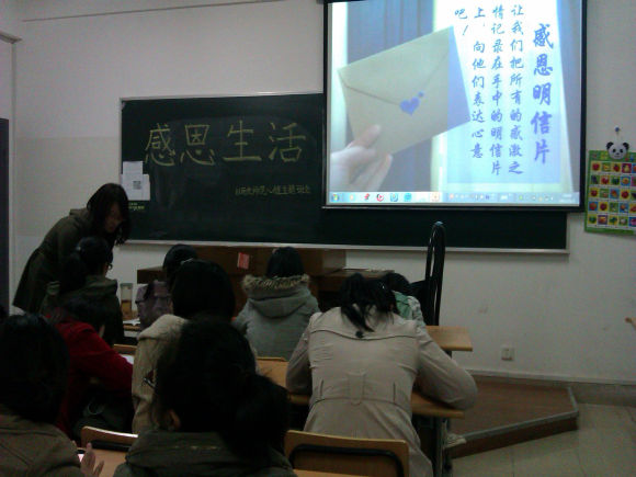 活动伊始,杨梦婷和王艳丽同学介绍了教师院“德馨”心理气象站部分成员,大家用热烈的掌声表示欢迎。接下来,一段由大学生自拍自导的微电影《天堂午餐》拉开了此次“感恩生活”心理主题班会的序幕,几位同学纷纷站起来与大家分享了他们有关亲情、友情或是爱情的感恩小故事。大家静静的倾听,感悟着小小事件中体现出的浓浓情谊。接下来,“击鼓传花之真心话大冒险”这个游戏使此次心理班会进入了高潮阶段,,由最后接到花的同学通过这个平台来表达内心的感激之情抑或是愧疚之意。“德馨”心理气象站的成员也借此倾述了他们心中的感动。整个教室洋溢着浓浓的感恩之情。最后,进入了“感恩明信片”的环节,到场的每个人都在明信片上写上心中的话,由杨梦婷、王艳丽同学统一寄出。