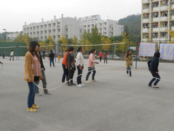 11级思政班的同学在仙林校区西区排球场举办了班级的特色活动:跳长绳。活动前夕,思政班的同学们在人人上做了大量的宣传。思政班的同学们的人人主页被11思政班的主页君在人人上的状态给很欢乐的刷屏了。受最近风靡全球的“江南style”的影响,思政班的同学本着与时俱进的时代步伐,掀起了“冬日style”跳长绳热潮。思政班的同学将跳长绳活动作为班级的特色活动,定于以后的每周三下午准时举行,这次活动也引起了11级辅导员翟老师的高度重视。