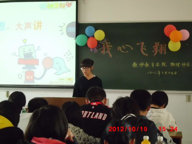 12级物理师范班的同学们在南京师范大学仙林校区学明楼的313教室开展了名为“我心飞翔”的理想树立主题班会。活动中同学们兴致高涨,该班会获得了一致好评。