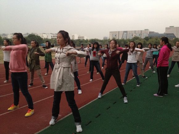 每天傍晚5点,西区田径场上,队员们满怀信心,在激情昂扬的音乐声中,进行常规训练。每次伸臂,每次抬腿,队员们无不认真对待,标准的动作尽显教师院青春向上的精神风貌。两位领操的同学细致入微,耐心地纠正每一个同学不到位的地方。负责人丁啸寒同学精益求精,亲自给队员们示范讲解,力求做到做好每一个动作。队员们更是全情投入,一遍遍重复着看似枯燥无味的动作,没有任何怨言,一心展现自我的青春风采,为院里争得荣誉。教师院11级辅导员翟云秋老师也陪同队员一起训练,为每位同学指导动作,给大家加油鼓气。师生同心,大家向着同一个目标努力拼搏。已近深秋,傍晚的田径场气温很低,但这丝毫不能影响队员们的热情,不坚持到最后一刻决不放松!