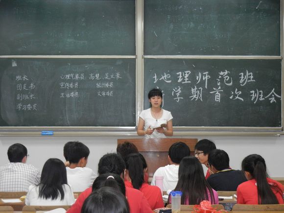 最后,地理师范班的班主任赵家荣老师也进行了讲话。她首先对转专业进入地理师范班的两名同学表示了热烈的欢迎,接着,她嘱托同学们在接下来的三年时间内好好学习,并反思已经过去的大一一年的时光,从中获得对自己有益的体会与感悟。赵家荣老师将她的话概况成了六个字,“好好玩,认真学”。正如赵家荣老师在上个学期已经强调过的一样,“快乐建立在付出之上”,只有认真学习,才能够收获属于自己的一片蓝天。最后,赵家荣老师预祝同学们都能顺利通过即将来临的计算机二级考试,一番真挚诚恳的话让同学们倍加感动。
