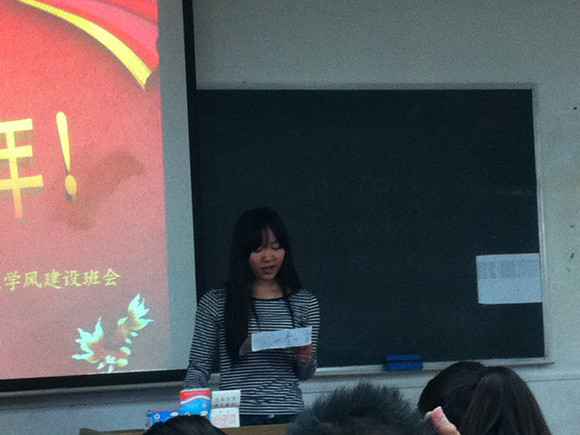 然后是2班学委周虹上台回报了一下开学这半个多月来新任班委们组织的班级活动。周虹说:“可能让大家印象深刻的只有两次大型班级活动,教师节聚餐和电影周。”这两项活动班委们都策划了很长时间。虽然不能让班中每个人都满意,但班委们都尽了最大的努力来权衡每个人的利益。还有暑期社会实践交流大会,优秀小分队、先进个人评比;教师节给老师们送祝福;给大一军训中的直系学弟学妹们送清凉;”Make the change”英语师范班特色志愿帮扶等一系列活动。班委们都认真投入到了这些活动中,并努力做到最好。