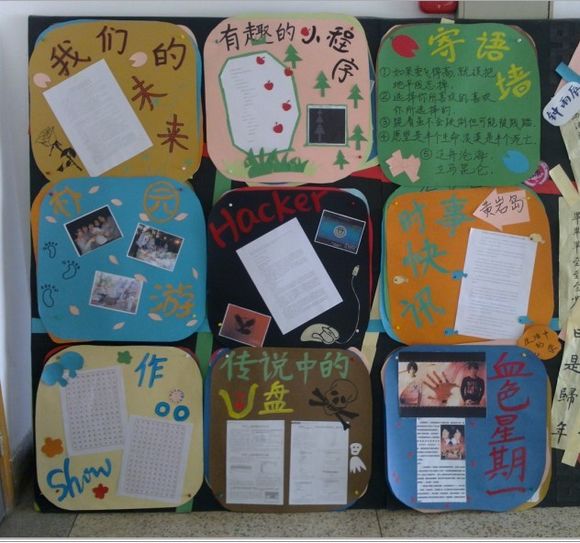 海报制作期间,同学们分工明确,各司其职又相互合作,很快一张图文并茂、个性鲜明的海报就新鲜出炉了。海报分为“我们的未来”、“寄语墙”、“实时快讯”等板块,分别从就业前景、专业知识、班级活动等方面展现了11级计算机师范班的风采。