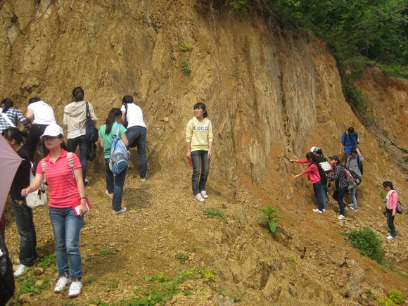 本次地质实习分为两个阶段,5月7日至9日为第一阶段。在这一阶段中,同学们在南京周边地区进行了地质考察。幕府山、燕子矶公园、汤山、孔山……带队的老师们不辞辛苦地为同学们找到了最适合观察岩石特点的地段,使同学们在欣赏金陵美景的同时,也能够更加系统地学习到沉积岩与岩浆岩的相关知识。虽说三日来天公不作美,时而艳阳高照时而寒冷侵衣,但是同学们的热情并未因之而消减。踏过了泥泞不堪的小路,走过了曲折蜿蜒崎岖不平的山路,同学们得以了解到各个岩层的演变与岩层组的特点。