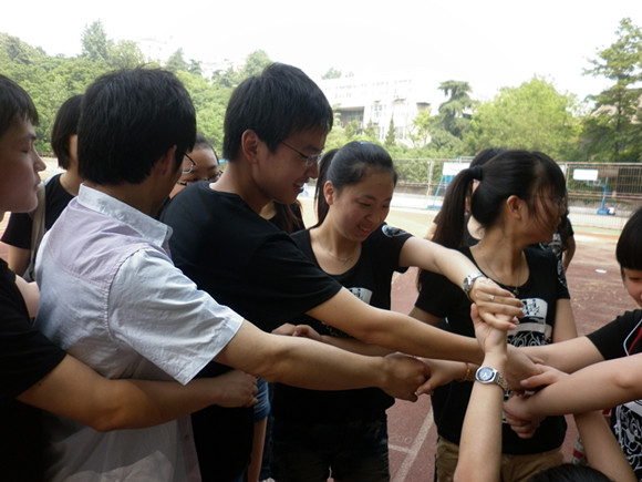 接下来就是素质拓展之游戏环节了。在随园校区操场,全班同学分为5个小组,每组8人围成一个圈,每位同学的右手牵对面同学的右手,左手拉除对面同学的左手,在最短的时间内恢复成一个圆圈。这是大家从未玩过的“解手链”游戏,考验了大家的团结协作能力,同时也挑战了同学们的才智。解手链最慢的一组同学则接受惩罚夹气球。经过小圆圈的牛刀小试,更大的挑战来了:全班四十余名同学围成一圈,解开一个巨大的手链。经过大家的共同努力,同学们成功地完成了任务,给自己最热烈的掌声。最后,大家在愉快的心情中返回仙林校区。本次素质拓展活动圆满结束。