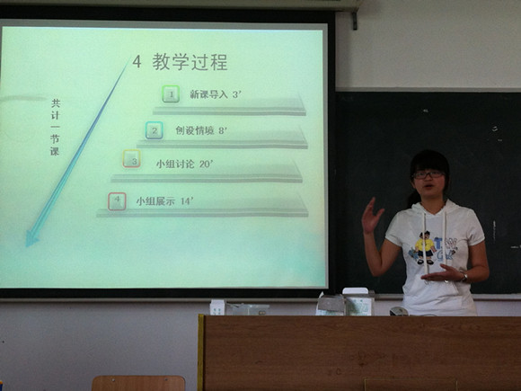 选拔赛的第一部分为说课比拼。11级汉语言文学师范班的张秋思、陈可佳、张琰、陈美娜、朱烩、朱明霞6位同学分别进行说课展示。说课内容各异,有讲解中国文学作品中的饮食文化的,优美的文字和美味的食物让同学们垂涎三尺;有讲解希腊神话的,还有讲解孙悟空悲剧性的,也有介绍人物张爱玲的,还有分析海子诗歌的。同学们听后仿佛都接受了一番知识的洗礼。虽然6位说课同学没有受过专业训练,但说课能力依然毫不逊色,别有一番名师的风采,同学们都听得很认真。