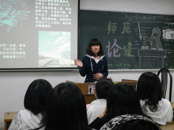 经过之前的自愿报名,最终确定演讲的人选:谢婷婷、孙明智、王金燕、邱爽和余京娟五位同学。这几位同学都做了精心准备,紧紧围绕各自的主题依次做了精彩的演说。作为11级思政班班长的谢婷婷同学,首先与大家分享了她对“功利主义”的看法。她和大家互动,提出一个令人难以抉择的问题,引发在座所有同学的思考。谢婷婷同学还向大家介绍了功利主义的创始人边沁,指出要正确地看功利。孙明智同学选择了两会期间比较热门的话题:异地高考。他以生动的语言、精美的幻灯片音频,深刻而独到地剖析了异地高考政策的必要性。通过各地真实的事例,孙明智同学表达了他对教育制度改革的呼吁。“很多在外务工的家长,不得不把孩子送回老家,让他们花时间重新去适应环境,而往往很多学生的成绩就此下滑。”孙明智同学的演讲赢得大家的阵阵掌声。