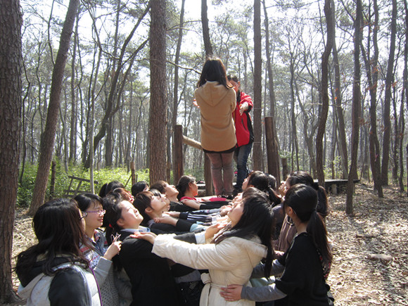 第一个项目是“信任背摔”, 在一个1.5米左右高的站台上,一个同学必须被绑住双手,由教练将其向后推倒,倒在由同学们用手臂架成的垫子上。此项目旨在加强团队成员间的信任度,项目结束后,同学们纷纷感慨“信任与被信任都是一件幸福的事”。接下来进行的是“挑战5分钟”,要在五分钟内完成传递高尔夫、管子移动、单脚翻布和圆圈拍手这四个小项目。在这个活动中,同学们的毅力和合作力得到了极大的考验。