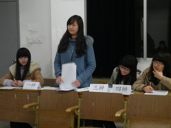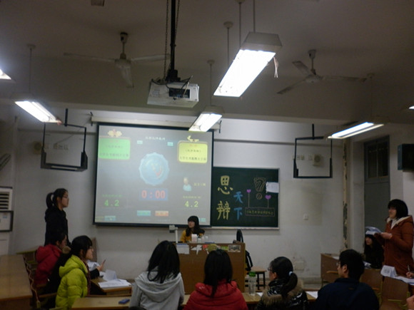 11级思政师范班在仙林校区学明楼204教室举行班级特色活动——“思辨天下”辩论会第二季。本次辩论赛还特邀11级物理师范班同学参加,物理师范班张一驰、朱凌霄同学担任特别评委。