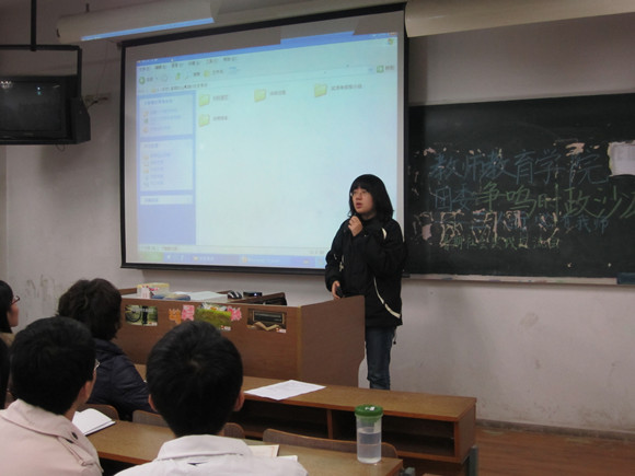 接着,优秀小分队和杰出个人的代表走上讲台,向在座的老师和同学介绍了暑期社会实践的经验。张立同学从活动的前期、中期和后期三个方面,提纲挈领地介绍了活动流程,并总结了以下经验:活动准备充分,资料搜集详尽,总结整合到位。陈子晨同学则从微观着手,详细分析自己所带领的小队在活动中遇到的问题,介绍克服困难的方法,展现了她们不畏艰辛的精神。教师院的同学们不仅结合自身专业,利用师范生的身份特点开展活动,还充分关心党和国家的大事要事,有针对性地进行实践。结合建党90周年的主题,以红色经典的传承为基点,秦海月同学带领小队在南京凤凰书城开展活动,并成功签署协议,建立了实践基地。金恺秋同学的暑期社会实践小组以“心牵百姓,情系三农”为主题,关注社会热点问题,表现了当代大学生对农民工生存现状的关注。在暑期社会实践中,各小队的团队合作也碰撞出了经验的火花。张圣梁同学从小组的活动中概括出了7条法则,崔羽同学则用一张幻灯片总结出实践的收获。他们都认识到团队合作的重要性。张圣梁同学认为,在争取赞助和支持方面,真诚待人才能与他人顺利沟通。崔羽同学则指出,第一次进行暑期社会实践,勇气不可或缺。同学们分享介绍经验的过程,也是思想交流碰撞的过程,不同的活动形式和活动主题都得到了展示,真正体现了沙龙“争鸣”的主题。听着台上学长学姐们的经验分享,11级的同学们获益匪浅。而讲述者的幽默与亲和,也让沙龙现场的气氛非常活跃。