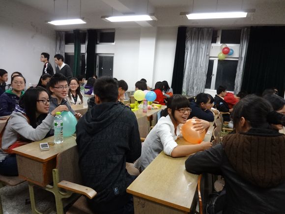 交流会由夏凯同学和袁媛同学主持。首先进行的一项内容是班主任李晓亮老师的致辞;接下来进行的是“八方会谈”,每组的六个老生和六个新生相互自我介绍,老生介绍了南京很多的旅游景点等,给新生提供了很多学习生活上的经验;再接下来的一项是“跟着我的尾巴往下唱”,每一组接着上一组唱的歌的最后一个字唱,接不下去的有惩罚措施;接着是“心手相印”,被选上的人根据所摸的人的手判断是男是女,再叫出名字;最后进行的一项是“画龙点睛”,就是叫一个人上黑板画一下眼睛、鼻子、嘴巴和头发。交流会气氛十分活跃,达到了最高潮。
