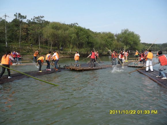 享受完美味的烤肉,同学们分成两队,登上竹筏进行个一场有趣的比赛。比赛过程中,甲方同学见追赶不上乙方,就把自己的竹筏连起来,挡住了乙的去路。虽困难重重,但经乙方“殊死搏斗”,终突围成功取得胜利。湖面上荡漾着同学们欢乐的笑声。