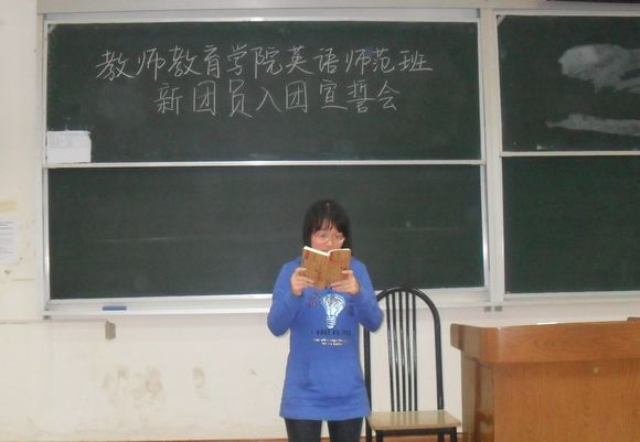 10级英语师范班在刘颖同学的主持下于仙林校区学明楼502教室举行了新团员入团宣誓会。10级英语师范班的全体同学都参加了此次宣誓会,见证了李圆同学加入中国共青团的宣誓过程。