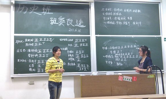 在班长朱晓丽同学的主持下,有意参加新学年班委职位竞选的同学依次上台进行选举演讲。在大一担任班级职务的多数班委在今晚也纷纷登台,或谋求连任或尝试新角色。除了这些老面孔外,亦出现许多新生面孔。如汤伟同学在竞选组织委员演讲中强调,在经历了一学年院学生会工作以及各类社会实践活动的历练后,在收获成果的同时也更意识到自身依旧拥有许多发展的空间。找一个全新的锻炼自我,挑战自我平台是其参加新一轮班委竞选的初衷之一。同时,将从其他工作实践中学习到的经验与能力更好地融合运用于班级工作中或许会带来意想不到的惊喜,甚至拥有更大收获,这是其参加竞选的又一初衷。除了汤伟同学,包婧雨同学,王莹同学等在大一学年未担任班级职务的新面孔们都积极参与到新一轮竞选中。虽然竞选结果几家欢喜几家愁,但同学们的热情参与才是感染历史班每一份子的终极源泉。 通过无记名投票、公开唱票等环节,历史师范班班委改选会在同学们热烈的掌声中圆满结束了。在这里,再一次恭喜侯新闻、潘明娟等九名同学在改选会中胜出,成为新班委团体中的一员,祝愿在新的学年中创造出更多惊喜。(博彩网址大全