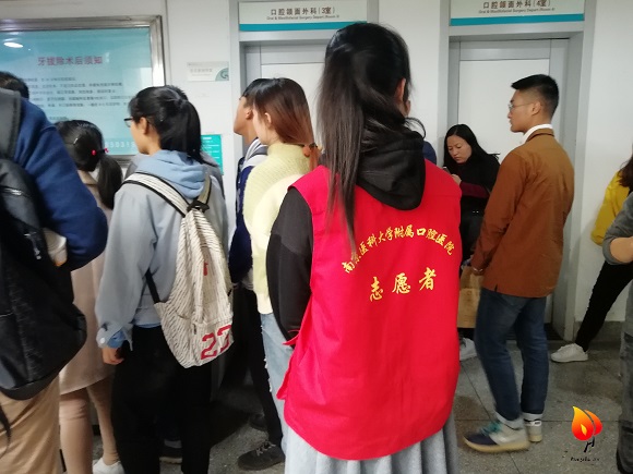 在二楼的牙体牙髓科的志愿者的主要工作是维持秩序。因为口腔医院的牙体牙髓科是比较火热的,所以此处的就诊秩序不是非常好。志愿者一开始对工作不是很熟悉,不知道要做什么、如何做,医院的工作人员就热情地帮助她。工作人员告诉了志愿者应该站在哪个位置维持秩序,志愿者也虚心地听取了建议。