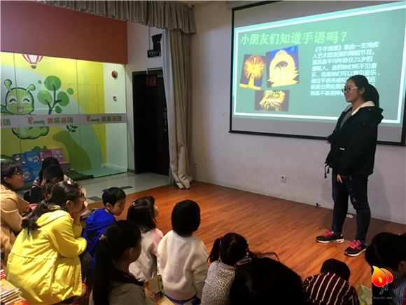 最后主讲人播放了《感恩的心》手语视频,有几位小朋友在看视频的过程中就已经开始跟着视频中的表演者做动作。放完视频后,有一位女生主动上台和志愿者学习《感恩的心》手语表演的片段。