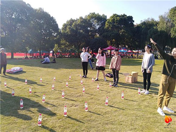 参与者到来后就正式开始游戏了。第一站在月亮湾,这里有两个打卡项目,一个是栖霞消防志愿团队设计障碍跑游戏,另一个是爱之源志愿团队设计的寻找卡片游戏。为了方便游戏的进行,确保所有人能同时开始,工作人员先将七支小队分成两拨,分别同时开始室外的两个游戏,完成游戏后再继续下一个地点。当月亮湾的两个游戏都完成之后就要前往学正楼了。有的参与者非常机智,因为两地有一定的距离,所以她们灵活地用上了共享单车,比其他小组抢先到达了学正楼。