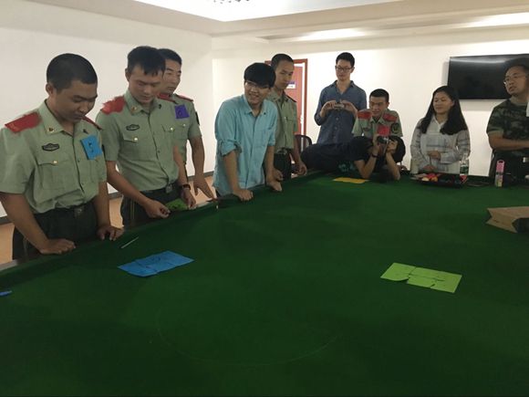 接下来一个环节是“信任之旅”。主持人在消防队员中选出一名队员作为带领,其余成员蒙上双眼,手拉手,排成一列,在没有任何指示的情况下完成了上下楼梯,跨越障碍物等任务。回到原场地后,消防队员们相互分享了在进行“信任之旅”时的感受。此环节加深了队员之间的信任感,通过接收信息和传递信息提高了队员之间的默契。