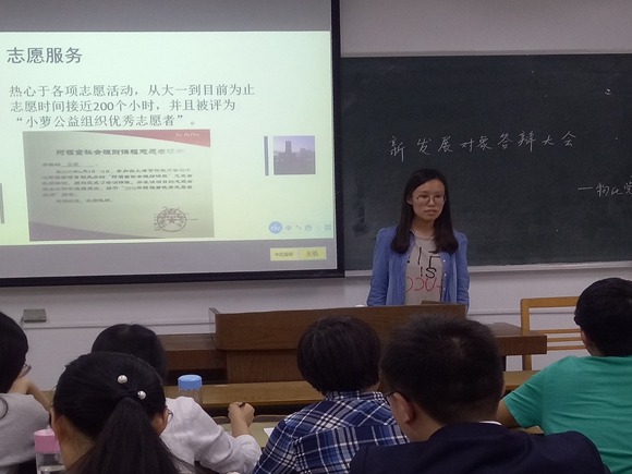 会议一开始由支部书记说明会议流程及评委打分标准,接着由25位入党积极分子轮流上台进行4分钟以内的自我陈述,从入学以来的工作、学习、思想、志愿服务、平日参加支部活动等方面,对自己进行总结,还要分享自己学习党的基本知识及关注的时事热点所获得的心得体会。仲朴星同学谈及自己对最近萨德部署事件的看法及中国对应的措施,条理分明、逻辑清晰,可见其对国家时事的关注及自身的思考;魏代娜同学谈及对党风党纪、党员批评与自我批评的认识;李滨同学谈及自己对民主集中制的看法与理解,分析的到位较透彻;徐中昊同学谈论改革开放前期党的历史,足见其平时对于党史的学习与思考,台上落落大方、从容镇定、幽默风趣,且群众基础较好。糜雪同学认为党的最大政治优势是密切联系群众,党执政后的最大危险是脱离群众,感悟深刻。其他同学表现也都非常优秀,明确表达了自己入党志愿。