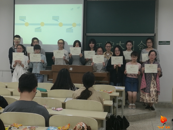接着,主持人王诗文为评选上优秀干事的各部门干事们颁奖并合照。干事们依次上台领取奖状,每个人脸上都绽开了满足的笑容。一张张奖状凝结着干事们一个学期以来的努力和汗水。然后是各部门被评选为每月之星的干事们上台发言。各部门的干事们分享了自己的日常工作与经验总结,并表达了对学姐学长的感谢。