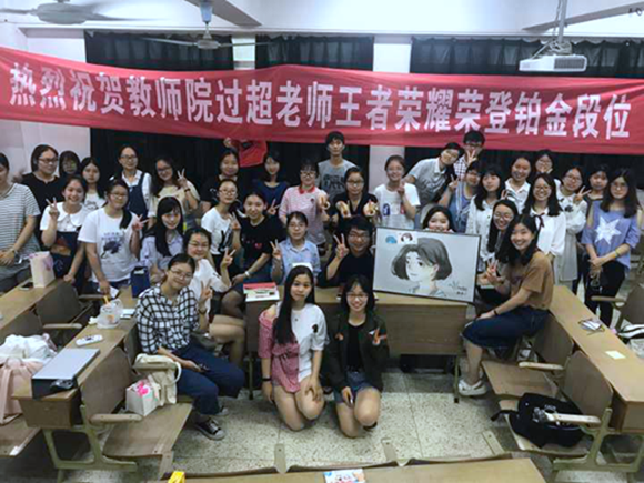 总结过后,全场熄灯,每个人都大声说出了对过超老师深切的感谢和依依不舍,赠送了事先准备好的神秘礼物——一本满载着祝福的相册,并拉出一条长长的横幅表达对过超老师的喜爱与祝福,过超老师非常感动。