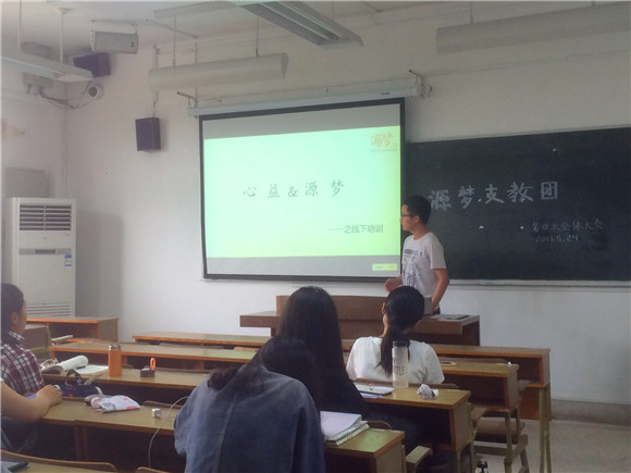5月24日下午,源梦支教社第四次全体大会于仙林校区学明楼413教室顺利举行。此次大会由社长魏婷主持,大会总结了本学期的社团工作,公布了支教人员分配,并且介绍了支教地的风土人情。