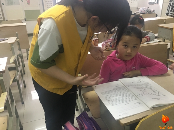 坐在第一排的有个小女生,作业留的比较多,动作也比较慢,到最后只剩下她一个人还在活动室了。她向志愿者提问也是怯怯的,轻声细语地说话,显然是比较胆小害羞。志愿者就坐在她身边,认真地倾听她的疑问,耐心地向她解释题目的意思,给出提示,启发她思考。到了六点多,她的作业终于完成了。志愿者们就和她一起下楼,看着她被奶奶带走才放心地离开,准备回校。