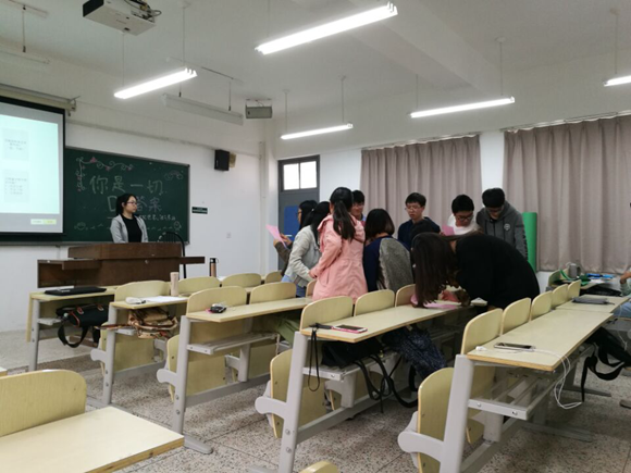培训伊始,同学们进行了一次有趣的记忆考验游戏,带动了现场的氛围,使得各个部门的同学变得活络起来,现场的气氛变得很热烈。紧接着进入了此次培训的第一个高潮:王杨清雅同学在现场进行了一次“问答”并互相观看了答案,答案相同的进行签字,让大家发现兴趣相同的人。紧接着是第二个高潮全体干事观看了一个视频,视频里主要讲述了一个女生的内心对一件事情的各种猜测,王杨清雅同学给干事们讲述了美国心理学家埃利斯创建的情绪ABC理论,引导大家进行思考,培训的最后,王杨清雅同学让干事们在绿色卡纸上写下了自己最近发生的让自己心情不愉快的事情,把纸撕碎了,参与培训的干事们一起将碎纸片粘在一张大卡纸上面,将其拼成一张爱心。