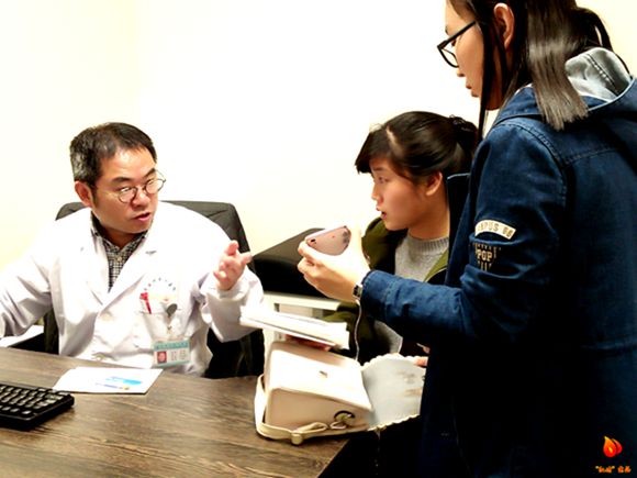 和上次志愿的日子一样,今天的南京依旧是细雨如烟,看来志愿者的召雨功力也堪比萧敬腾了。为了准时到达医院与志愿负责人完成交接工作,志愿者早早地就在学校正门集合了。踏上长达一个多小时的漫漫车旅,再步行绕过几条泥泞老街,志愿者们就来到了南京市第一医院的大门前。彼时专家门诊已经从原来的老房子搬迁到新建的大楼里,兜兜转转好几圈,她们才终于准时地见到了主治医生。看诊人群还未达到高峰,与主治医生进行短暂的交流后,志愿者们已整装待发,开始协助医生工作。过了一会儿,走廊便里响起广播叫诊的声音,在家人的陪同下,病人们开始依次地走了进来。