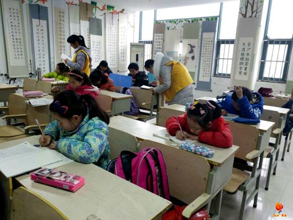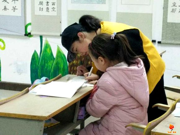 志愿者身穿黄马甲在教室里巡回走动,眼睛时刻关注着孩子们的状态。“老师!”开始有孩子举手寻求帮助。看他们那自然熟练的提问方式,可见这个课堂已经建立起孩子们和志愿者的默契。解答这些问题,志愿者们显然得心应手,但他们并不直接给出答案,而是一步步引导孩子们的思路,循循善诱,启发他们思考。有时遇到有疑惑的问题,志愿者们也会一起讨论,共同指导。孩子们渐渐松开的眉头,似乎说明志愿者的辅导是极其有效的。接下来的两个小时就在这样教学相伴、其乐融融的氛围里度过。有些早早完成作业的小朋友还未等到家长来接,我们的志愿者便陪伴在旁,耐心地教他们写字画画,一时欢声笑语。