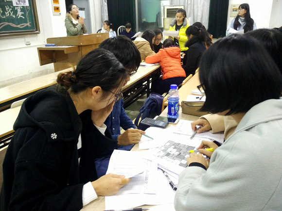 德馨心理气象站仙林校区学海楼210教室成功举办了”heal me”趣味挑战赛的复赛——沙漠掘金。经过初赛有关心理知识的比拼后,共剩下九支队伍参加本次复赛。比赛模拟了“沙漠掘金”的过程,每五分钟作为一天,模拟从营地到大山进行掘金的整个过程,并要应对各种各样的恶劣天气制定出合理的路线,在比赛过程中各支小队都进行热烈的组内讨论,通过五个人的合作与协商力争携带最多的金子回到营地,加强了小队的凝聚力。