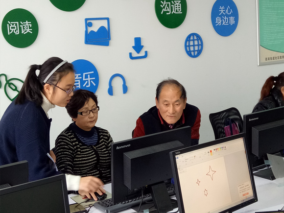 不到两点,就有好学的老人来到教室,复习上节课所学的内容。由于上节课的“画图”内容较难,许多老人没有熟练掌握,志愿者们便不厌其烦地将上节课的内容帮老人复习一遍。虽然这影响到了今天内容的学习,但是确保了老人们能够熟练掌握上次所学的内容。