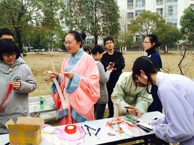 正值春季,和暖的微风吹拂着大地,也吹拂着女生们萌动的心。通过前期的网络宣传,此次活动反响热烈。许多同学都早早地到达了活动地点。当视野中出现一大批身着华美古装的窈窕女子时,大家不由得发出了一声惊呼。静言汉服社的社员们有条不紊的安排好一切后,活动便开始了。经过社长的一番仔细介绍,我们得知此次活动的内容是参与者在彩缎或花签上写下自己的心愿,然后系于树枝上,并可以拍照合影留念。许多女生纷纷在彩缎上写下自己的愿望,例如“我要变瘦!”、“我要脱单!”等等。天气晴朗,鸟语花香,树枝桠上也是一片勃勃生机,现场的女生们或是欢笑嬉戏,或是与自己的新年愿望合影留念,场面十分热闹。