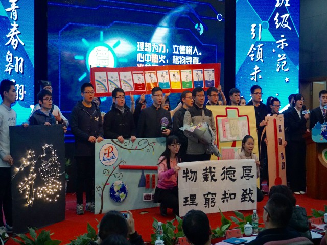 厚德载物,致知穷理。新颖的创造力是他们的智慧之光,紧密的凝聚力是他们的青春之火,现场展示环节中,1307班物师学子将心路历程一一道来:在道德情操上,班级成员立于道德之肩,担当社会责任,汗洒青春,共筑中国梦:无论是晓葵课堂暑期夏令营,为社区孩子带来欢乐,收获成长;还是心心相伴,开展温情暖冬活动,鼓励同学们服务家人以礼,书写三行家书,并在微博接力传承;他们前往兆园,陪伴独居老人,并得到了南京晨报的报道,他们绘制板报,在教师节向敬爱的老师们书写贺卡,心怀感恩…”在两年的时间里,秉持优良班风,在立德树师的道路上不断前行。“判天地之美,析万物之理。”班级成员积极探索,博览群书,修养才华,丰缮德资,知行合一。班级组织参加陶行知纪念馆,思辨古今教育理念,培养时代教育情怀;开展“铭记历史,缅怀逝者”主题教育活动,提高自身修行;前往贵州开展支教,走进社区传递知识,践行社会主义核心价值观。接下来的现场答辩环节中,当评委老师问及1307班同学关于独特服装的设计理念,同学镇定自如,简明扼要地阐释其内涵,并感悟古今教育理念。师长楷模,德育传承。最终,物师班级获得了德育第三名的好成绩。