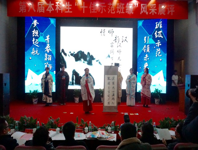 “汉”蕴诗情,青春满溢,书声琅琅,古琴铮铮。现场展示环节,汉师成员带来了一场别开生面的原创诗会。流芳古韵,共话新篇,以年华作笔,以汗水为墨,13级汉语言文学师范的同学们在人生中挥洒着独属于他们的精彩的篇章:时刻谨记“明辨敏行,含弘知礼”的班训,以独树一帜的学风建设构筑风骨,积淀底蕴,建设学风,科研创新,品味经典,诗情传承;聚焦讲台,师生互动;集思进取,师生共进;他们吟诗弄墨,挥斥方遒,学风建设优良,学习氛围浓厚。 “汉师儿女需规矩,家国万事定方圆。”汉语言文学1301班以汉师公约中一系列保障性制度和为活跃课堂气氛而制定的激励性制度为支柱,师生共建文明课堂。在课外,积极举办持续性强,覆盖面广,推广性佳的各色品牌活动。每学期的采风活动和《汉风》原创作品集,展示班级风采的“古语新韵”诗歌大赛,无不显示出他们过人的才思。他们积极锻炼教学能力,扎实教师技能,硕果累累,成绩醒目:英语四级、江苏省计算机一级通过率为100%,1人获国家奖学金,2人获朱敬文奖学金,还有多名同学获得国家级省级竞赛奖项…现场答辩环节,面对评委的问题,汉师学子镇定自若,流畅的表述了汉师的教育理念,完美的展现了汉师风采。1301汉师班级最终斩获了校学风建设第五名的佳绩。