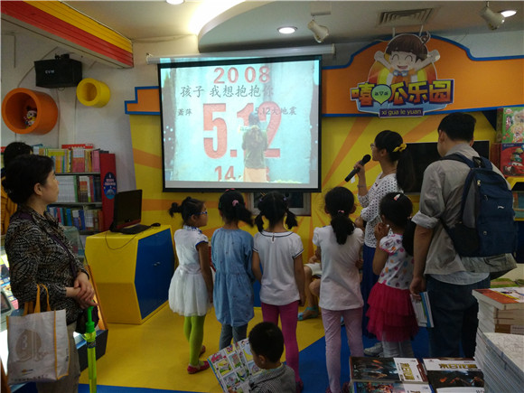 下午一点半左右,志愿者们到达凤凰书城。活动开始前,志愿者通过广播吸引了大批小朋友前来四楼活动地点。小朋友们在等待过程中,兴奋地与担任志愿者的大姐姐们交谈,十分期待这次志愿者们带来的“我是朗读者”。两点整,主持人招呼小朋友来到小舞台,活动便正式开始。志愿者这次为小朋友们带来了四首关于纪念5·12四川汶川大地震的诗歌,伴着音乐小朋友们认认真真地听着,与此同时也吸引了很多家长的驻足,一首诗歌结束便有小朋友自告奋勇读诗,活动进入了高潮。小朋友你一句我一句,气氛活跃融洽。