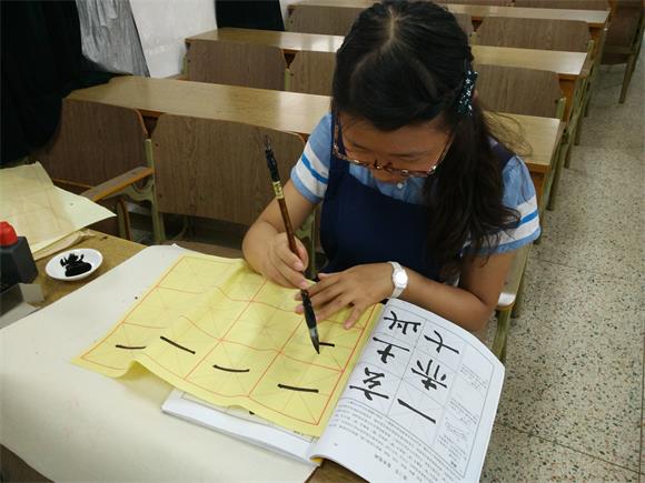新同学先向大家做了简短的自我介绍。了解到新同学才刚刚接触书法,还不太懂,同学们在自己认真练习的基础上,也很愿意帮助她。李兰若学姐也向新同学介绍有关书法的基本知识,手把手地教了新同学一些基本的笔画,还嘱咐到,刚刚开始学习书法不能够着急,要踏踏实实地先从笔画开始练习,等到练的差不多了再开始练字。学姐的耐心讲解,亲手指导,每一个细微的动作,无不让身旁的同学想起刚刚开学的时候,自己对于书法青涩的模样。转眼间,大半个学期已经悄然流逝。但,时光流逝并不重要,重要的是我们自己收获到了很多。学姐还鼓励到,书法尽管会有些枯燥,但坚持一段时间之后就会有效果的。大家都因为经历过了这个阶段,深有体会地点了点头表示赞同。大家还大方地向新同学分享自己练习过程中的经验,新同学认真听着,表示自己一定会努力的。