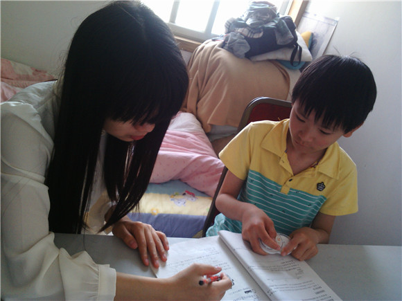 很快就把作业搞定的李阳觉得有些无所事事,便拿起旁边的手机想玩游戏,志愿者温和地劝李阳放下手机,找一些其他书本学习,接着从书包里拿出了英语教科书,让李阳朗读课文,考察他对文章内容的理解程度以及发音是否正确。刚开始李阳并不是很愿意,读的也很小声,志愿者在一旁鼓励他不要害羞,大胆地放大声音,读错了也没关系,不会的尽管提问。李阳渐渐不再那么紧张,指着一个单词说不会读,志愿者便用手机查询该单词的音标,并播放标准的发音,然后将音节拆开来教学生读,反复多次,力求学生发音准确。对于一些发音相近的单词,志愿者也会着重于细微的不同之处,让学生能够准确辨析两者。